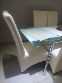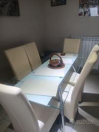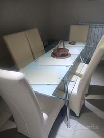 Tavolo in vetro cristallo con piedi d'acciaio con 6 sedie in pelle con piedini in legno tenuti molto bene