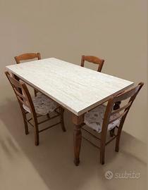 Tavolo da pranzo allungabile cm 150x80 con prolunga da 30 cm, sono comprese da 6 sedie abbinate. Il tavolo e le sedie presentano segni di usura dovute all’utilizzo quotidiano ma in buone condizioni e perfettamente funzionanti. Il tavolo é già smontato pronto per essere portato via.