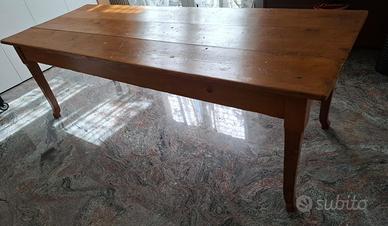 Tavolo costruito con legno recuperato da tavolo da lavoro leggermente levigate la lunghezza 250 larghezza 93 altezza 79. le tavole sono appoggiate tra loro. il piano è di spessore 4 circa. Il tutto con finitura effetto grezzo naturale trasparente impermeabile
