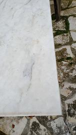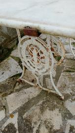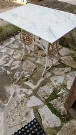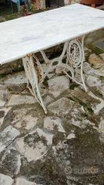 tavolo da terrazza/giardino realizzato da dalla base di una antica macchina per cucire (singer) cui è stata applicata una lastra in marmo bianco dai bordi smussati,misure 100x60,h.75cm