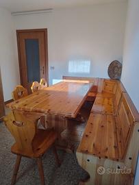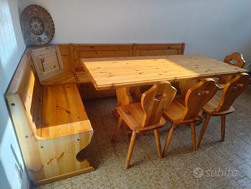 Vendo tavolo in pino massello, tenuto molto bene, con cassapanca e 4 sedie Tavolo 180x80 cm cassapanca ad angolo 150x245 4 sedie come da foto (3 perfette, 1 con schienale risistemato) Non spedisco