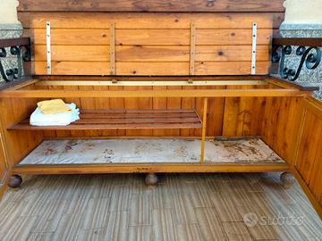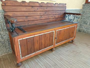tavolo in ferro battuto e legno misure: 76x120 h80 con tre sedie di legno e cassapanca con contenitore misure: 150x45 H 97