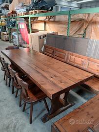 come da titolo vendo tavolo da 10 posti con 5 sedie più 5 posti su cassapanca. misure ingombro cassapanca 310cmx160cm misure tavolo 90x250cm in aggiunta 3 mensole più un porta abiti. possibilità di accordarsi su eventuale trasporto dopo visione.