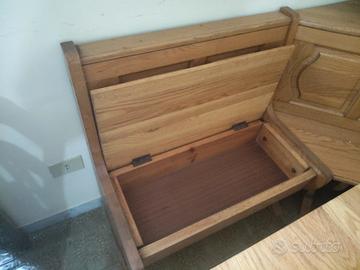 Tavolo con cassapanca e sedie in legno massello in perfette condizioni. Vendo per inutilizzo. Dimensioni: tavolo 160x80, cassapanca 357x50 + 3 sedie in legno e paglia.