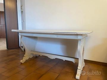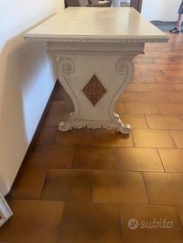 Tavolo rettangolare tipo “fratina” laccato panna con due cassetti a scomparsa e intarsi laterali. Utilizzabile anche come scrivania.