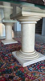 tavolo di grandi dimensioni con basamenti a colonne in marmo e parte superiore delle colonne in legno marmorizzato, completato da piano in vetro.