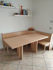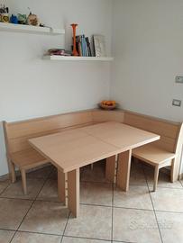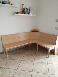 In ottime condizioni vendo giropanca più tavolo allungabile in stile moderno color faggio; compresi cuscini fatti a mano su misura totalmente sfoderabili.