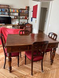 Tavolo fisso rettangolare realizzato in legno di noce, dotato di Tre cassetti frontali ed appartenente d’epoca ai primi del ‘900. La struttura si presenta semplice ed essenziale, e vanta proporzioni armoniose e sapientemente equilibrate. E’ arricchita da sobri montanti, impreziositi solamente con delicate torniture.