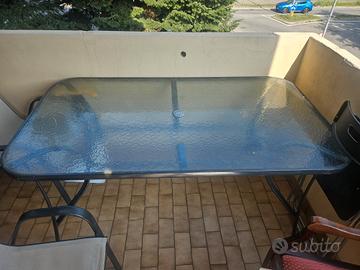 tavolo con ombrellone da usare in mezzo al tavolo o fuori, con 6 comode sedie da gardino ottimo stato