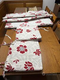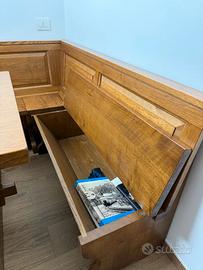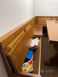 Tavolo con panca angolare e 4 sedie, presenti cuscini su misura per tutte le sedute. Cassapanca contenitiva. Dimensioni tavolo 220x95 cm Dimensioni panca: 315 cm lato lungo, 170 lato corto, 91 altezza schienale, 51 profondità. Prezzo leggermente trattabile