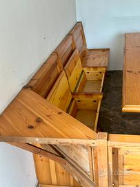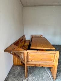 Tavolo in legno con panca angolare in stile rustico.