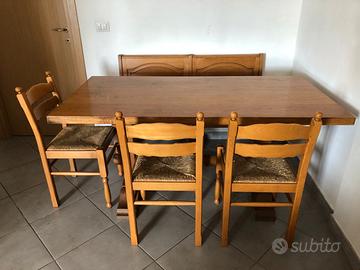 bellissimo set tavolo in legno massello color frassino cognac con panca con 2 contenitori mis. tavolo 162 x 82 cm. alt. 79 cm. panca 130 x 43 cm. alt. spalliera 86 cm. no spedizione solo ritiro in zona. (le 3 sedie in legno seduta impagliata in regalo).