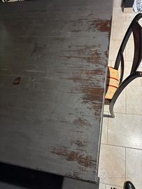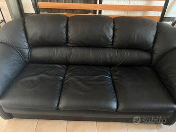 Vendo tavolo in legno 3mt x 123 con 2 panche. Colorato di grigio scuro con qualche usura come da foto e divano nero in pelle 3 posti. Trasporto a carico dell’ acquirente.