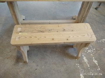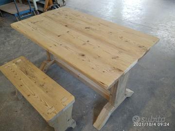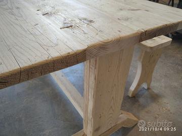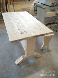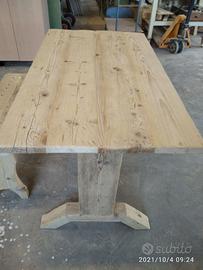 tavolo costruito in legno vecchio recuperato da solai o parancole da muratore leggermente levigate in modo che siano morbide al tatto mantenendo la pattina originale naturale che il tempo ha fatto con misura lunghezza 140 larghezza 80 altezza 79 con le 4 gambe costruite con pattina in tutti i lati da circa 9 x 9 unite tra loro con traverso sottostante proporzionato e traverso di congiungimento tra unione delle 2 gambe dx e sx, le gambe saranno inclinate solo da un lato verso il centro di loro stesse, unione delle tavole con anima interna nascosta. Sotto al piano incassati ferri a T in modo che non si incurvi nel tempo. Il tavolo sarà smontabile. Tappi in gomma parte sotto per non rovinare il pavimento. Panchina costruita sempre in abete vecchio con misura lungh. 100 prof. 40 h 45 predisposta come da vs foto con seduta da 4 cm circa come pure le gambe con pattina in tutti i lati, gambe costruite sempre con stessa larghezza dritte leggermente sagomata lateralmente e sotto con traverso inclinato verso la seduta per renderla stabile. il tutto con finitura effetto trasparente in modo che il liquido non penetri nel legno. costruito e venduto su commissione di conseguenza teniamo a magazzino solamente le gambe il resto c'è da costruire essendo i diretti produttori possiamo costruirlo su misura in base alle proprie esigenze, NOI siamo i diretti costruttori li facciamo noi con le nostre mani siamo in grado di soddisfare qualsiasi richiesta che può essere su misura del cliente in qualsiasi materiale. il prezzo si intende franco fabbrica compreso di finitura imballo non comprendente di iva. per domande o dubbi contattateci. per noi conta dare vita al vostro sogno DIRETTAMENTE DAL PRODUTTORE. ASTENERSI RIVENDITORI E COMMERCIANTI