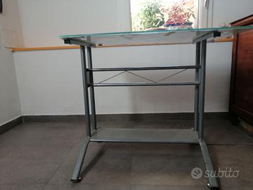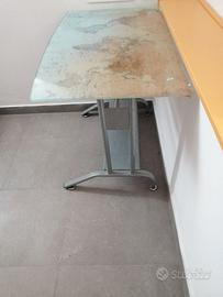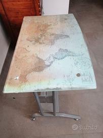 Tavolo/scrivania in metallo, con piana in vetro e cartina geografica in trasparenza. Supporti in metallo per la regolazione dell'altezza. Misure: lunghezza 90, larghezza cm 58 al centro e 53 agli angoli estremi. (La piana in vetro ha la parte anteriore stondata per una migliore ergonomia). Prezzo trattabile.