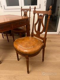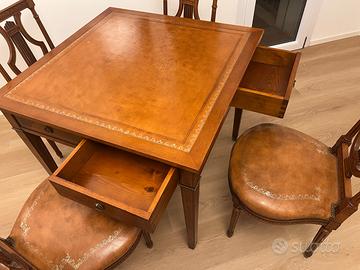 Tavolo quadrato con quattro cassettini (uno per lato) in ottimo stato, piano in cuoio marrone, con quattro sedie imbottite con sedute comode in cuoio a forma di lira. A Treviso in zona fiera.