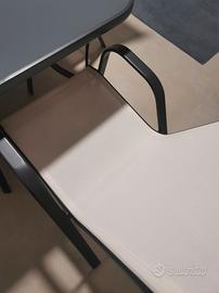 Tavolo da giardino 150x90cm vetro acciaio, Set di 6 sedie impilabili in metallo e textilene beige antracite LYMA