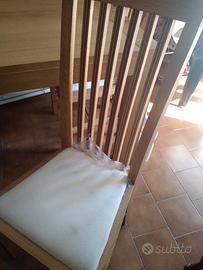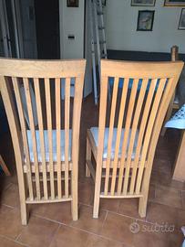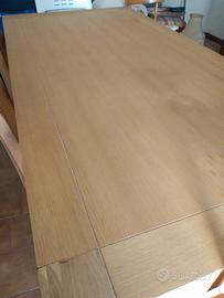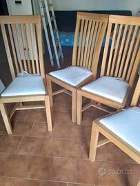 Tavolo con 4 sedie in legno naturale. Le sedie hanno la seduta in tessuto bianco e sono ancora incelofanate. Il tavolo è fisso e misura 190x90.