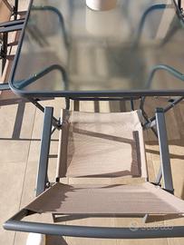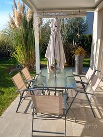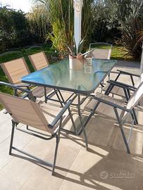 Vendo tavolo (telaio in metallo verniciato, piano in vetro satinato con foro al centro per applicazione ombrellone in tessuto misure: H 71 cm - L 140 cm - P 90 cm ). numero 6 sedie moto comode (metallo verniciato e tessuto plastico lavabile). tavolo usato ben tenuto sempre al coperto, (ombrellone nuovo mai usato), non spedisco. possibilità di eventuale consegna a domicilio con furgone nei paesi limitrofi.