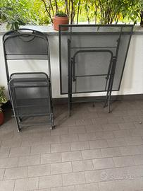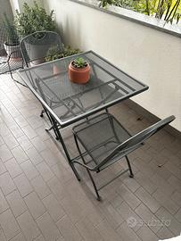 Tavolo e 2 sedie da esterno in ferro battuto. Entrambi sono pieghevoli occupando poco spazio una volta piegati. Molto solido e resistente agli agenti atmosferici.