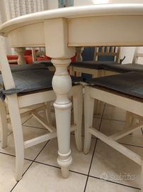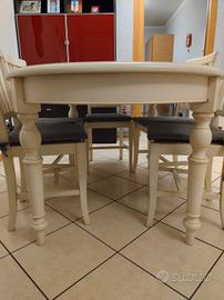 Tavolo allungabile con 6 sedie di colore bianco con misure 160 x108 ( nella parte più larga dell' ovale) . Il tavolo è di fattura artigianale di buonissima qualità, si tratta di un mobilificio della zona di Bassano del Grappa. Ci sono qualche segno di usura sulla parte superiore.
