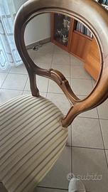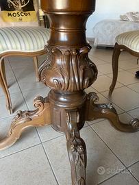 Il tavolo rotondo è marrone scuro in legno massiccio lavorato artigianale, le sedie sono state recentemente foderate. La cassapanca (contenitore) angolare ha la stessa fodera delle sedie. Diametro del tavolo 104cm mentre la cassapanca ha 54cm di lato. Come si può vedere dalla foto ci sono delle macchie ma considerando che si può mettere un runner o una tovaglia il problema non si pone.