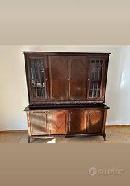 Dispensa con vetrinette, ante con ripiani e cassetti, stesso stile di tavolo e sedie.