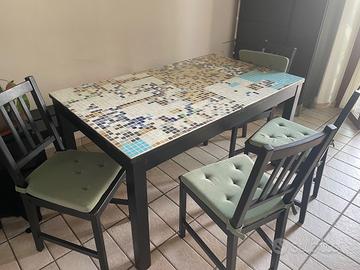 Vendo 4 sedie Ikea nere, ci sono graffi di gatto insieme a tavolo sempre Ikea nero, usato e rivestito da un mosaico con resina 140x84 allungabile fino a 220 condizioni sufficienti