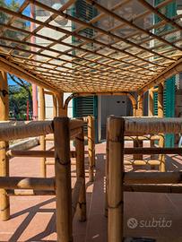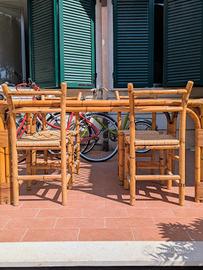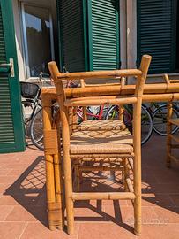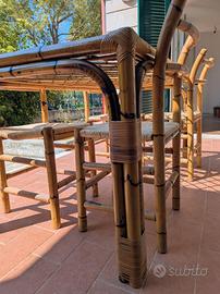 A Cervo ligure, provincia di Imperia, vendo tavolo in bambù con eleganti legature in midollino. Piano in vetro senza sbeccature con griglia sottostante integra. Più 4 sedie con sedute originali in paglia intrecciata in perfetto stato. Vintage italiano anni '70, realizzato artigianalmente, tutto in ottimo stato, utilizzato poco e sempre all' interno. Misure tavolo 148 x 78 cm Misura seduta sedia 38 x 38 altezza 86 cm. Ritiro in loco a carico dell' acquirente.