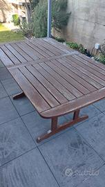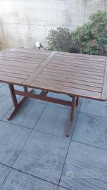 tavolo in legno da giardino apribile misura 154 cm x 90 cm quando aperto misura 198 cm di lunghezza, completo con 6 sedie. il tutto necessita di una riverniciata.