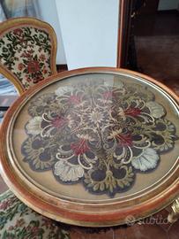 Materiali e decorazioni: La patina autentica in oro zecchino conferisce un fascino unico e prezioso, ideale per collezionisti e amanti dell'antiquariato. Il piano del tavolo presenta una copertura in vetro che protegge una decorazione originale sottostante, ricca di motivi floreali dai colori vivaci e ben conservati.