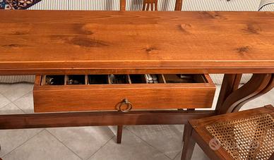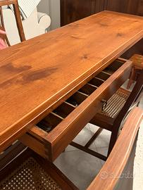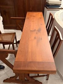 Tavolo in legno massello con 4 sedie. Il tavolo si puo’ chiudere a libro e diventa una consolle. Tenuto benissimo, vome nuovo. Misure: 1m,80 x 80 Chiuso 180x40