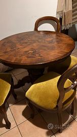 Tavolo tondo diametro 110.apribile 4/6 posti.vero legno con lavorazione artigianale.vendo con 4 sedie appena fatte rifare da tappezziere.il tutto in ottime condizioni.non spedisco. Prezzo non trattabile