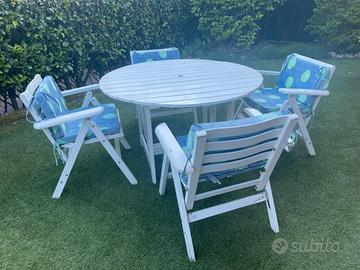 Tavolo in legno pieghevole con foro per inserimento ombrellone e 4 sedie pieghevoli complete di cuscini. Marca ELLEESSE