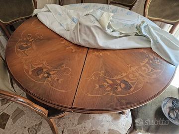 Tavolo rotondo estensibile con sei sedie, usato con parti danneggiate.