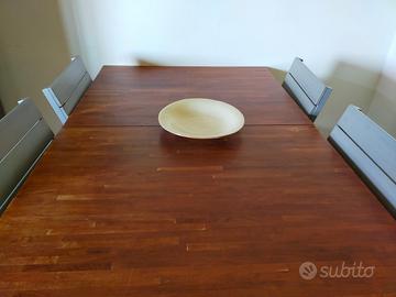Svendo per imminente trasloco. Tavolo in legno da interno ed esterno, misure 1.60 per 1.00, allungabile a 1,90. Ottimo stato. Smontabile. Sedie in legno grigie con inserti in metallo. Ottimo stato. Il prezzo è riferito a tavolo più sedie. Possibilità di acquisto separato. Se separati il costo del solo tavolo è di euro 230 e le sedie euro 30 cadauna.