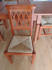 Tavolo in legno robusto , allungabile come in foto. Trasportabile facilmente(le gambe si smontano con una semplice chiave inglese). Le sedie sono 4, visibili in foto. Per il prezzo contattatemi.