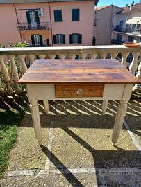 Piano in legno naturale con finitura calda e vissuta, struttura verniciata color chiaro. Presente anche comodo cassetto centrale.
