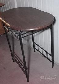 tavolo con struttura in metallo di colore nero, e ripiano in legno di colore scuro.