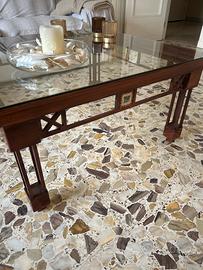 Tavolino basso con vetro., in ferro battuto effetto legno ed artifianale con piccoli mosaici nei lati come mostrato in foto. Ritiro a domicilio e pagamento da vicino. Contattare se interessati.