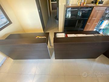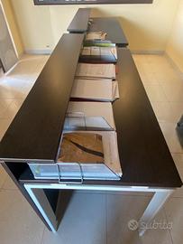 Set completo tavolo conferenze color wenge molto elegante, composto da 2 scrivanie autonome con alzata anteriore che si uniscono per creare un pezzo unico. Le due scrivanie con le seguenti misure: L 150 cm, H 90 cm, P 60 cm.