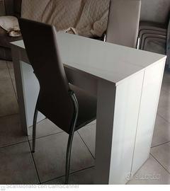 Vendesi in blocco per cambio arredamento: tavolo consolle bianco chiuso 90x51/aperto con 4 allunghe 2,35 m per 12 posti. 4 sedie in ecopelle colore tortora. Divano recliner manuale in tessuto idrorepellente tipo microfibra colore tortora. Il divano,come mostrato in foto,negli angoli posteriori è leggermente rovinato. Ritiro a carico dell'acquirente. Prezzo trattabile . No perditempo. Disponibili dal 09/03/2026