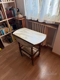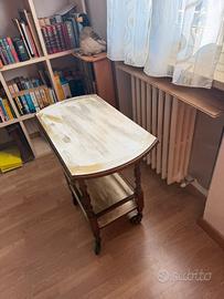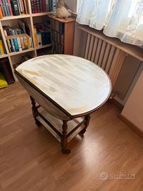 Tavolo consolle a ribalta in legno massello anntico finitura shabby chic con rotelle.