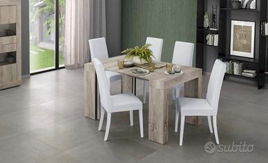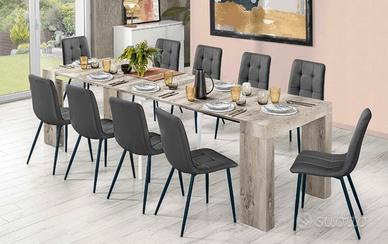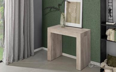 Tavolo allungabile che parte da una consolle trasformabile in tavolo da pranzo lungo fino a 294 cm tramite 5 prolunghe. Dotato di meccanismo di apertura su guide.