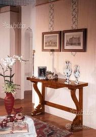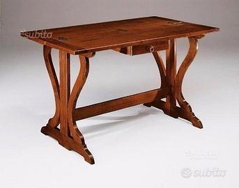 il tavolo ha le gambe sagomate e un cassetto centrale posto sotto il piano
