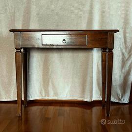 Vendo elegante tavolo consolle in legno massello dal design classico e lineare. Il mobile presenta una bella finitura in legno scuro che mette in risalto la venatura naturale.