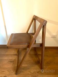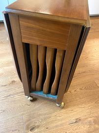 Favoloso tavolo consolle legno in teak di modernariato anni ‘70 con cassetto e comode rotelle, contenente all’interno 4 sedie pieghevoli di design in legno pregiato e morbida seduta in similpelle marrone.