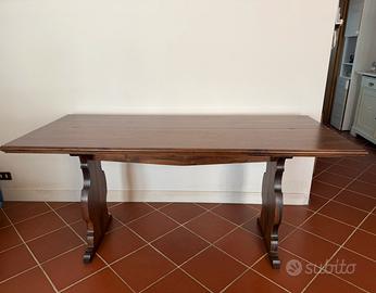 Tavolo a consolle chiudibile a libro per 6 o 8 persone. Stile rustico e legno massello. Qualche segno di usura. Dimensione chiuso: 181x83x40cm Dimensione aperto: 181x 79,5x80 cm