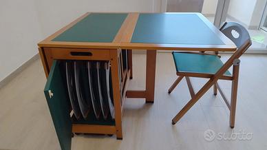 Contenente le 6 sedie con seduta morbida, si può aprire alzando una sola o entrambe le ribaltine laterali per diventare un comodo tavolo per 6 persone.