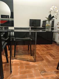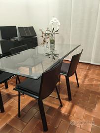 Vendo tavolo da pranzo moderno in cristallo temperato trasparente con piano rettangolare, accompagnato da sedie imbottite in elegante pelle nera. Il tavolo misura circa 180x90 cm, ideale per 6 persone, con struttura robusta e design minimalista che si adatta a soggiorni contemporanei. Le sedie hanno seduta comoda e struttura in metallo nero, perfette per stile industrial-chic.